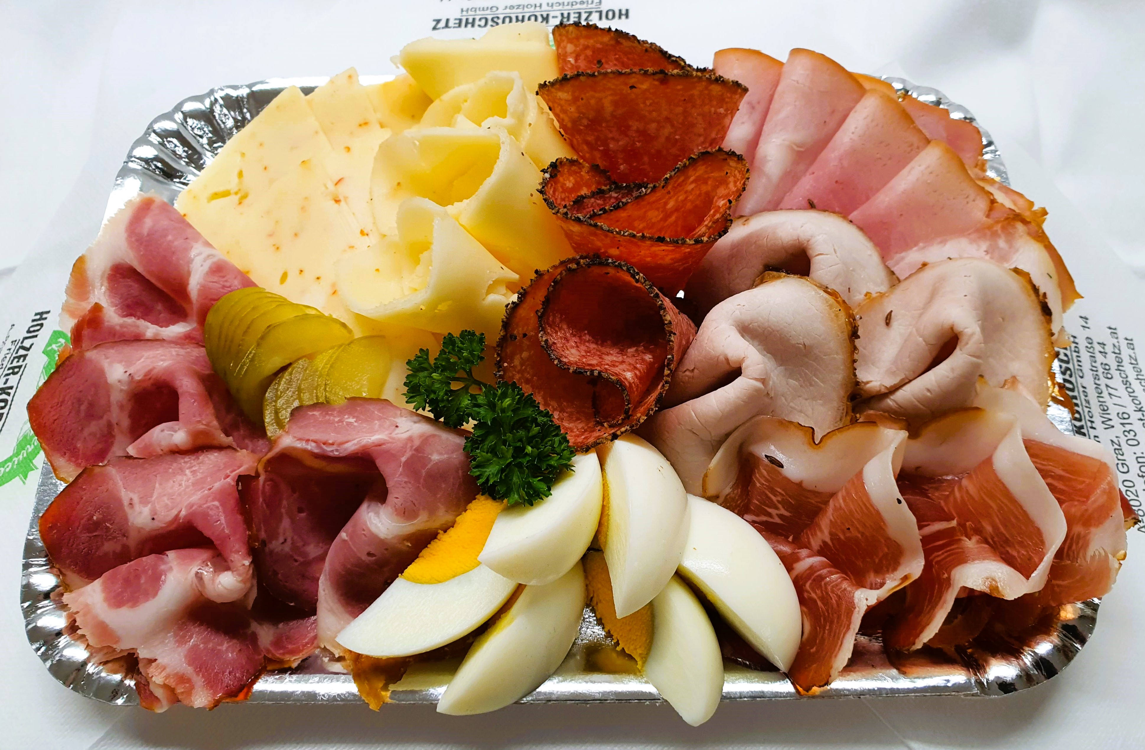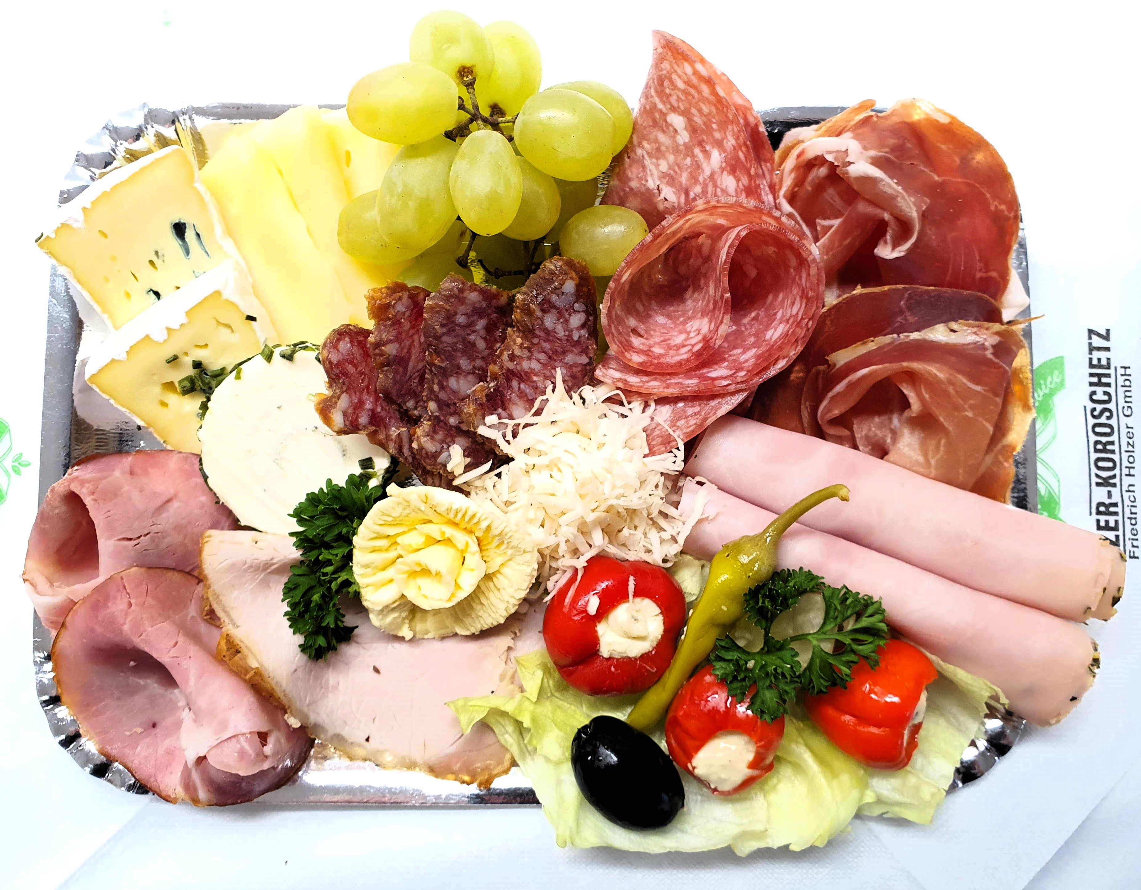 Festtagsplatte mit Beef Tatar, gefüllter Putenbrust, Rehfilet mit Enten Paté, geräucherter Entenbrust, Schinkenröllchen mit Gervais Creme, gefüllte Eier, Schweinsfilet mit Gänseleber Creme, Wildhasen Terrine, Roastbeef, Prosciutto, Bresaola, Kümmel Karree, geräucherter Heilbutt, geräuchertes Makrelenfilet, Räucherlachs, geräuchertes Forellen Filet, Jägerpastete und Burgunder Schinken